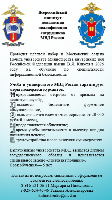Всероссийский институт повышения квалификации сотрудников МВД России проводит целевой набор в Московский ордена Почета университет Министерства внутренних дел Российской Федерации имени В. Я. Кикотя в 2026 году на обучение по специальности информационной безопасности.