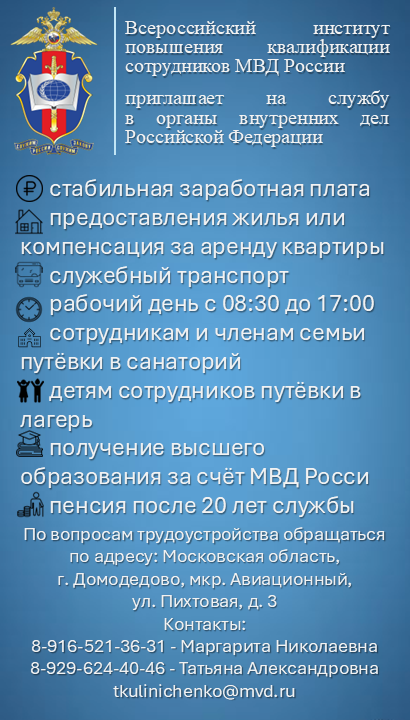 Всероссийский институт повышения квалификации сотрудников МВД России приглашает на службу в органы внутренних дел Российской Федерации: