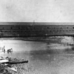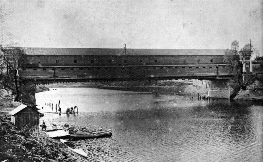 «В 1844-45 гг. инженер Никитин спроектировал новый однопролётный мост «по американской системе» с тремя деревянными несущими фермами и монументальными въездами, оформленными в виде триумфальных арок. Строительство было полностью завершено к 1853 году.