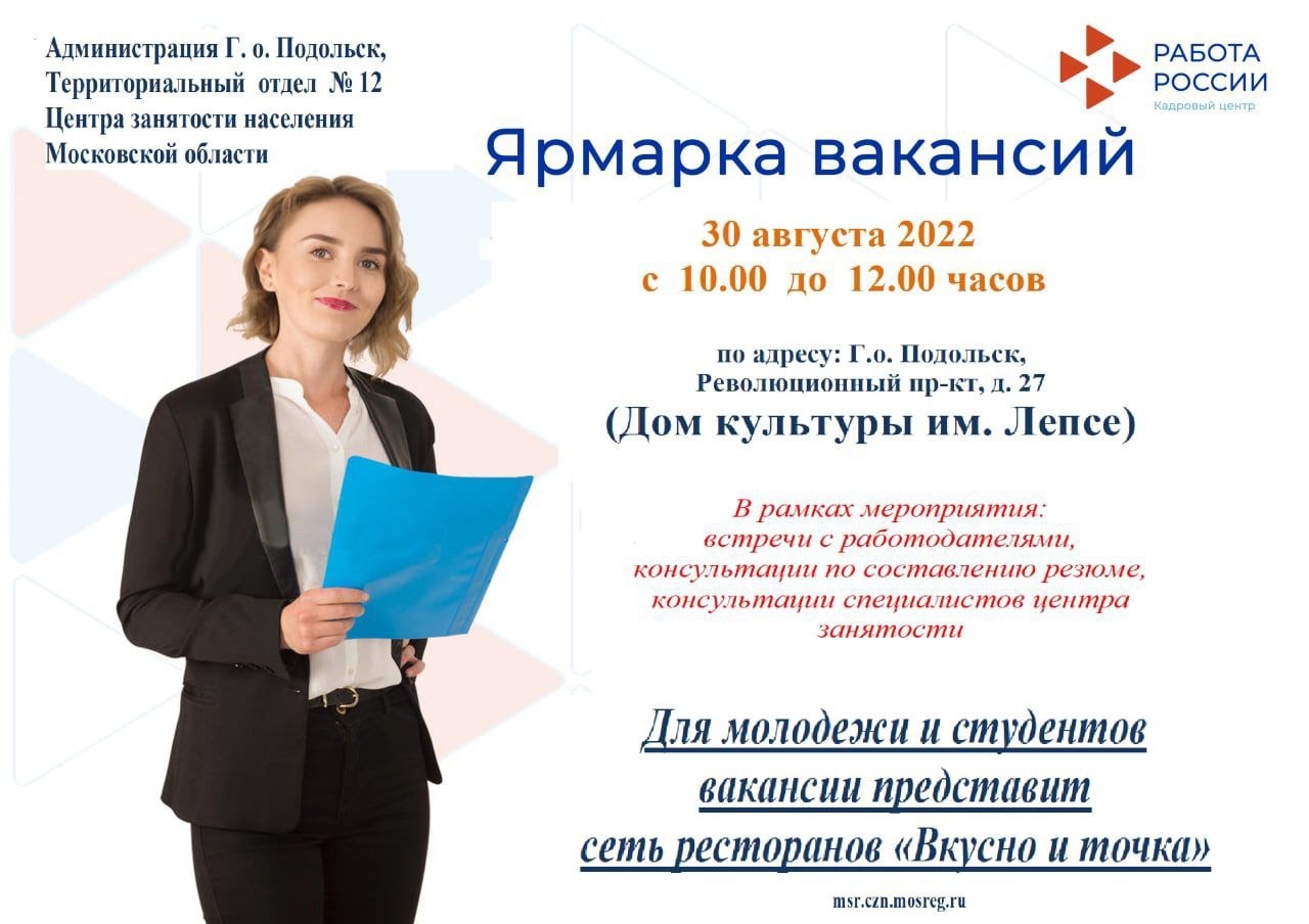 30 августа с 10:00 до 12:00 по адресу Революционный проспект, 27 (Дом культуры имени Лепсе), состоится ярмарка вакансий, организованная территориальным отделом № 12 Центра занятости населения Московской области и администрацией городского округа Подольск.