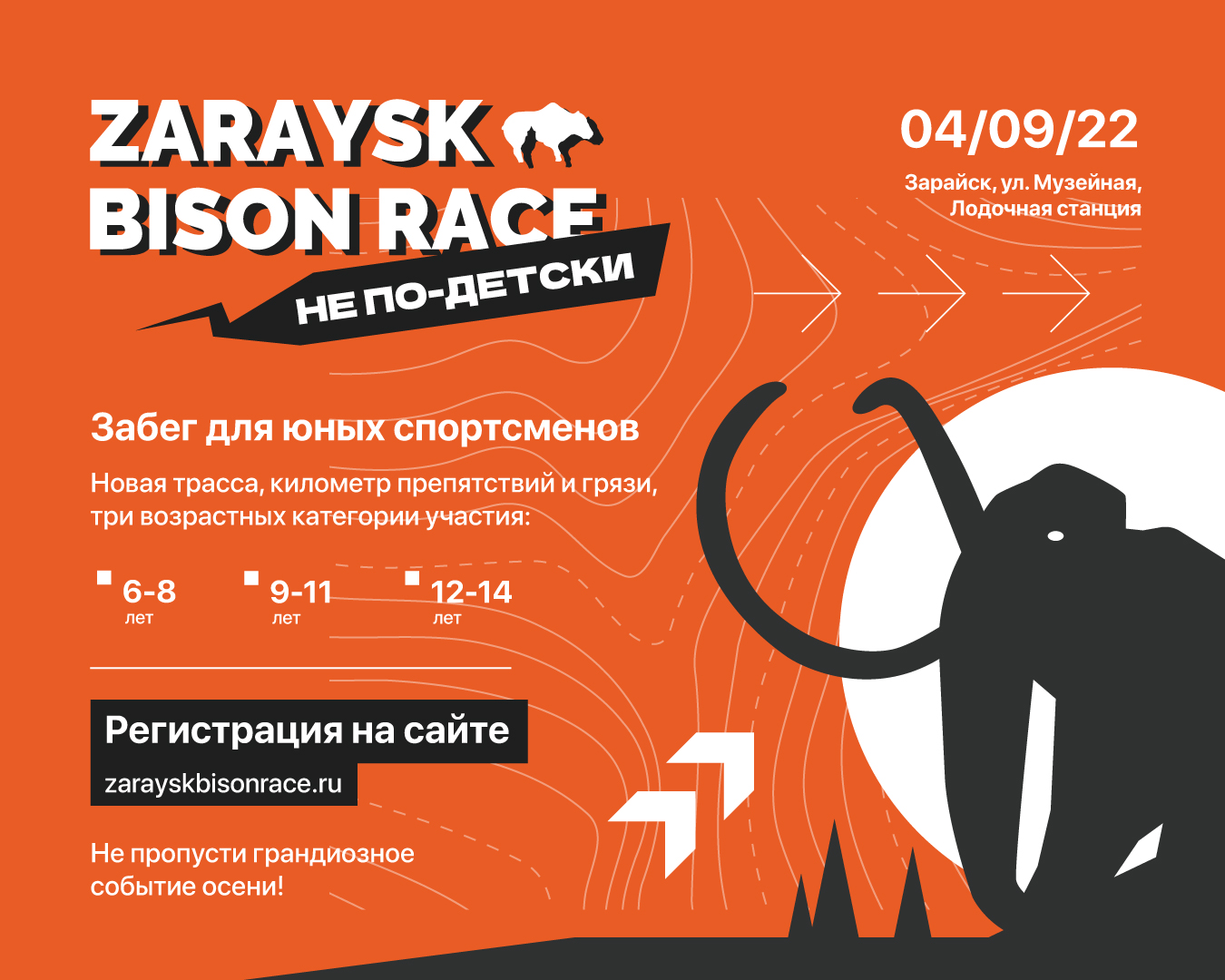 Команда «Zaraysk Bison Race» четыре года подряд проводила у Зарайского кремля массовый исторический забег для профессиональных спортсменов и любителей бега. С каждым разом мероприятие прибавляло и по участникам, и по организации, становилось массовее и масштабнее. В этом году забег был 21 мая, проходил при поддержке Фонда президентских грантов, Министерства физической культуры и спорта Московской области, Главного управления социальных коммуникаций Московской области, администрации городского округа Зарайск, а также подмосковного отделения общественной организации «Молодая Гвардия Единой России». Тогда команда организаторов задумалась, а почему бы не провести отдельный такой забег для детей? От слов – к делу. Уже 4 сентября состоится экстремальный исторический забег «Zaraysk Bison Race. Не по-детски». К участию приглашаются юные спортсмены, которым от 6 до 14 лет включительно.