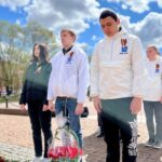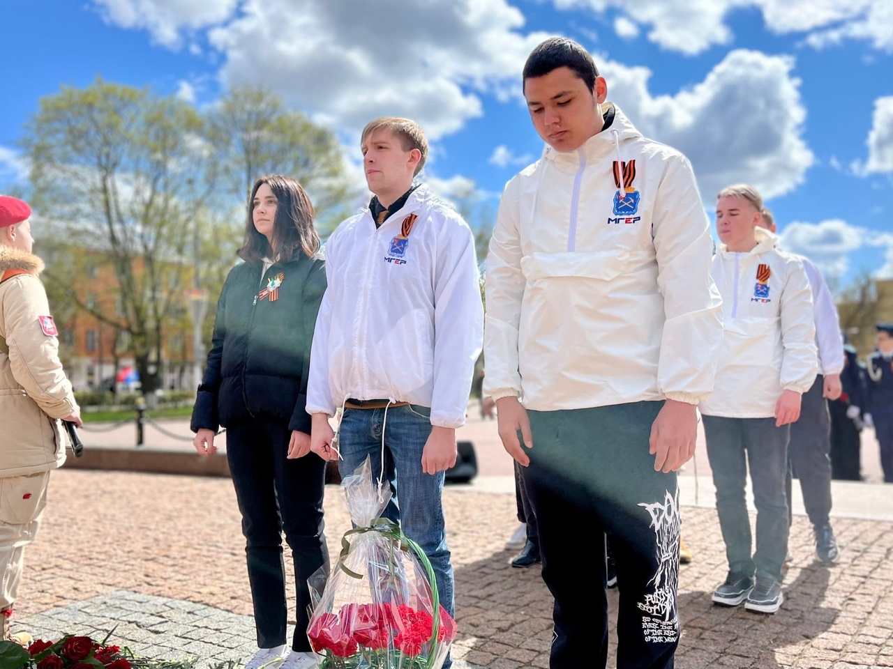 Молодогвардейцы вместе с другими участниками возложили цветы и гирлянды к Вечному огню на площади Славы и отдали дань памяти погибшим во время минуты молчания.