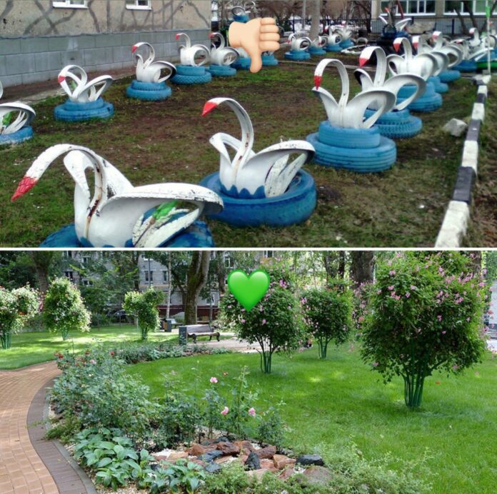 — Мы уберём скульптуры народного творчества из неэкологичных отработанных автопокрышек и обменяем их на саженцы. Живым растениям нужен живой дом! В ходе акции «Зеленый обмен» жителям почтенного возраста, которые вкладывают свои силы в озеленение двора и ухаживают за придомовыми клумбами, получат вместо старого хлама саженцы растений. Демонтаж резиновых «лебедей» и других неэкологичных скульптур состоится в ближайшие дни. Объявления будут заблаговременно вывешены на информационных стендах во дворах, чтобы пожилые люди не волновались за растения в них и успели их вовремя пересадить. Так мы проявляем уважение, бережём здоровье и спокойствие чувствительных пожилых жителей, которые старались на благо своего двора и понимаем, что они переживают по поводу расставания с «птицами из шин». Также жители сами могут помочь своему двору и начать заранее пересаживать растения из таких самодельных клумб, а резину сдавать в пункты приема, — рассказала Руководитель Главного управления содержания территорий Московской области в ранге министра Светлана Аипова.
