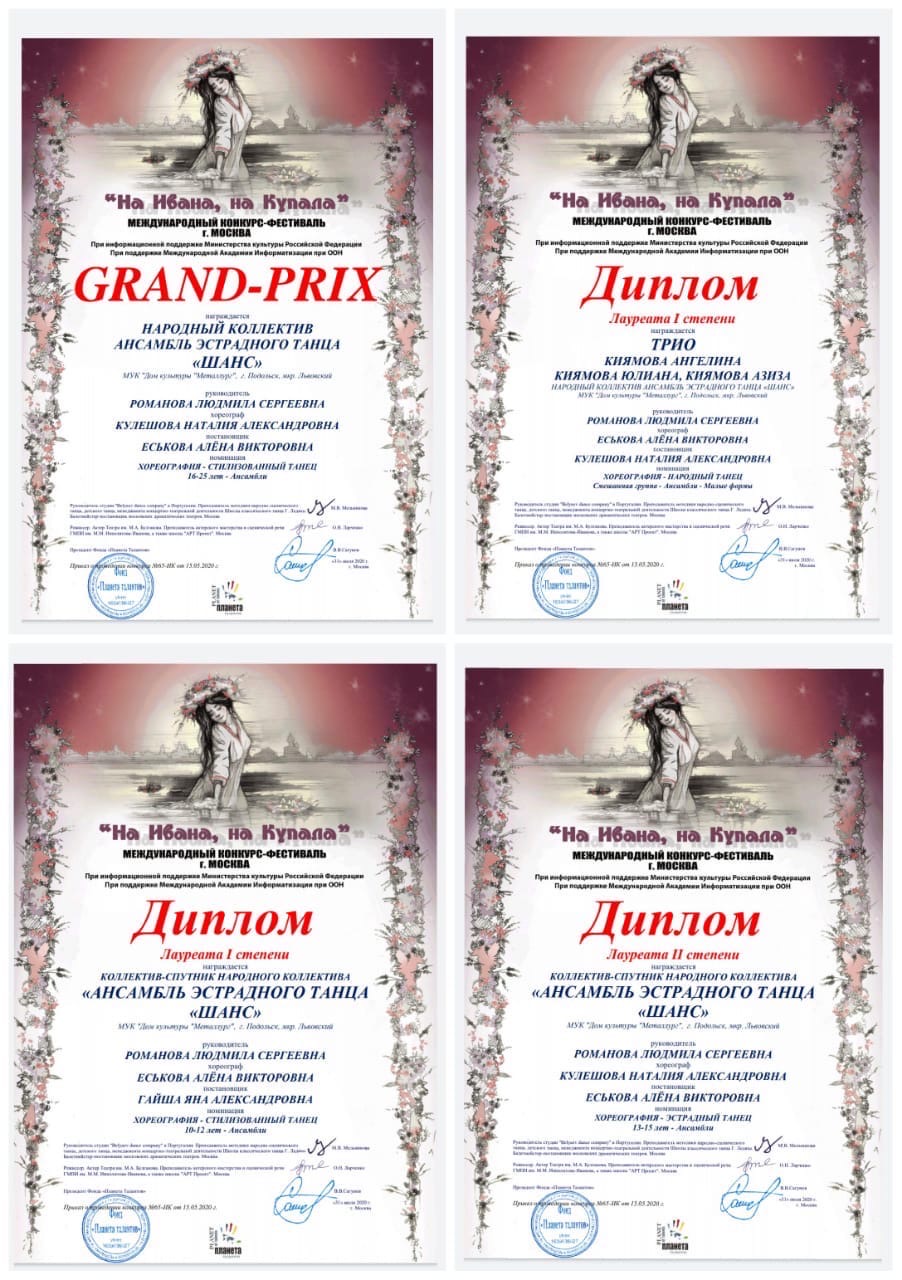 Этим летом Народный коллектив «Ансамбль эстрадного танца «Шанс» под руководством Л.С. Романовой принял участие в Международном онлайн-конкурсе-фестивале «На Ивана, на Купала», проходившем при информационной поддержке Министерства культуры РФ и Международной Академии Информатизации при ООН. Коллектив создан и занимается в Доме культуры «Металлург» микрорайона Львовский Городского округа Подольск.