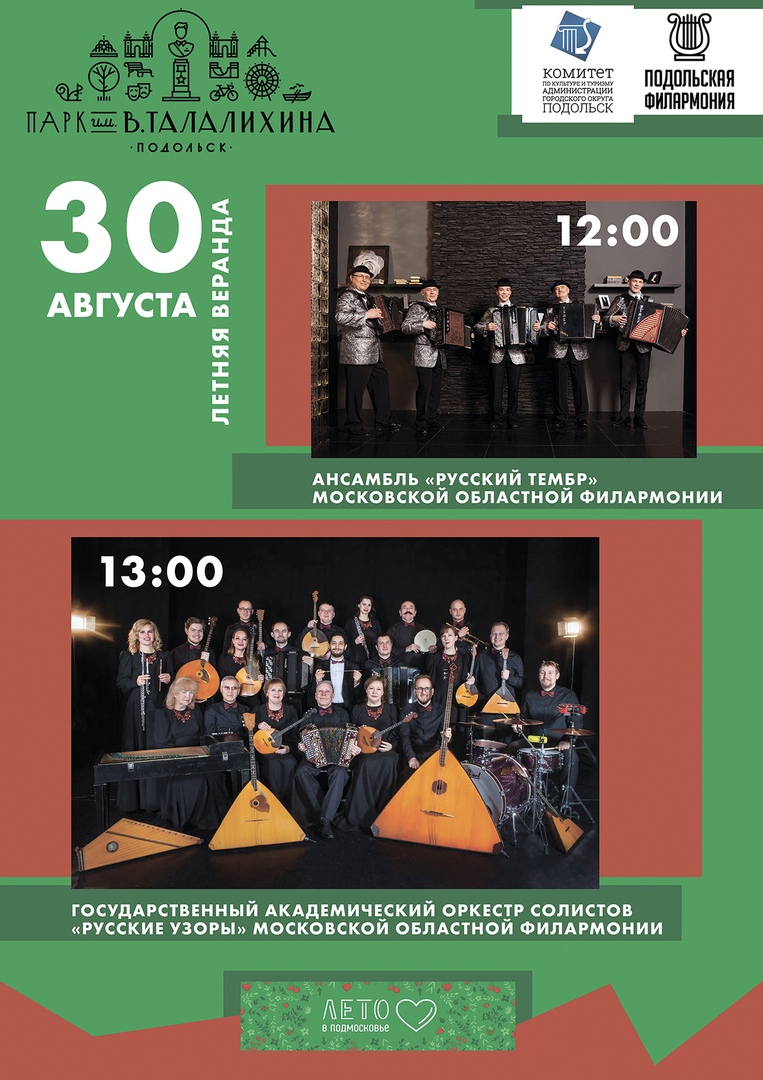 В воскресенье, 30 августа, в Парке культуры и отдыха им. Виктора Талалихина выступят два музыкальных коллектива Московской областной филармонии, об этом сообщили в Комитете по культуре и туризму администрации Городского округа Подольск.