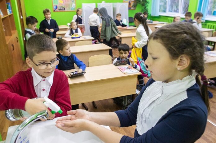 На каждом этаже установлены санитайзеры и приборы для обеззараживания воздуха. Также введена «беззвонковая» система – такая мера позволяет разграничить потоки учащихся в коридорах. В течение дня кабинеты регулярно проветриваются, проводится влажная уборка школьных помещений дезинфицирующими средствами.