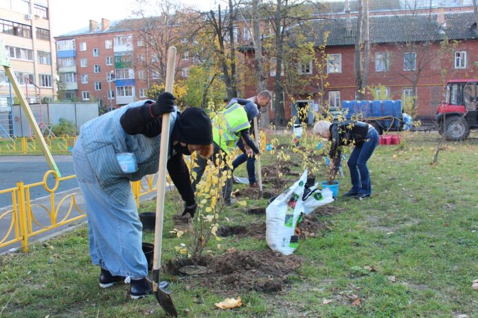 Возле детской игровой площадки в микрорайоне Климовск высадили 10 молодых рябин и 20 кустарников
