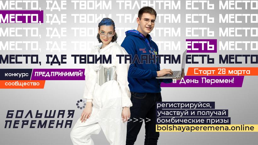 26 марта стартует новый сезон Всероссийского конкурса «Большая перемена» – проекта президентской платформы «Россия – страна возможностей». Открытие нового сезона самого масштабного конкурса для школьников пройдет в формате трехдневного онлайн-марафона и завершится 28 марта, в День больших перемен. Регистрация участников открыта на платформе bolshayaperemena.online до 1 июня. Об этом сообщили на сайте Федерального агентства по делам молодежи.