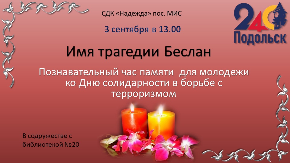 3 сентября в доме культуры Надежда пос. МИС в содружестве с библиотекой №20 состоялось мероприятие, посвященное трагедии в Беслане.