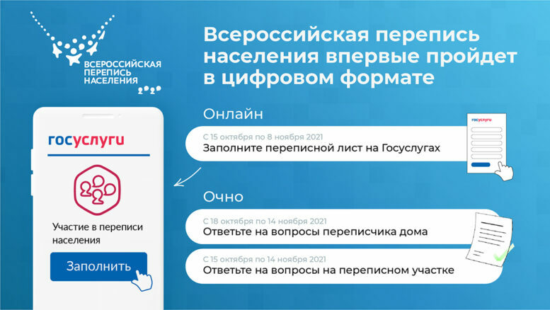 Всероссийская перепись населения проходит с 15 октября по 14 ноября 2021 года на большей части территории России, а в отдаленных и труднодоступных территориях перепись продлится до 20 декабря 2021 года. На портале Госуслуг заполнить можно электронный переписной лист с 15 октября по 8 ноября 2021 года.