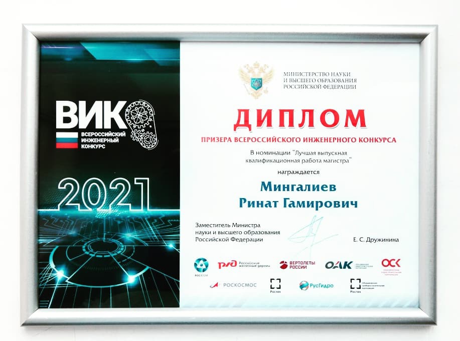«Основная цель была реализовать себя на научных площадках всероссийского масштаба, хотелось выступить достойно – представить результаты своей работы на уровне лучших молодых научных сотрудников до 35 лет: бакалавров, специалистов, магистров, аспирантов, кандидатов технических наук. Стать призером на данном конкурсе для меня большая честь», – отметил Ринат Мингалиев.