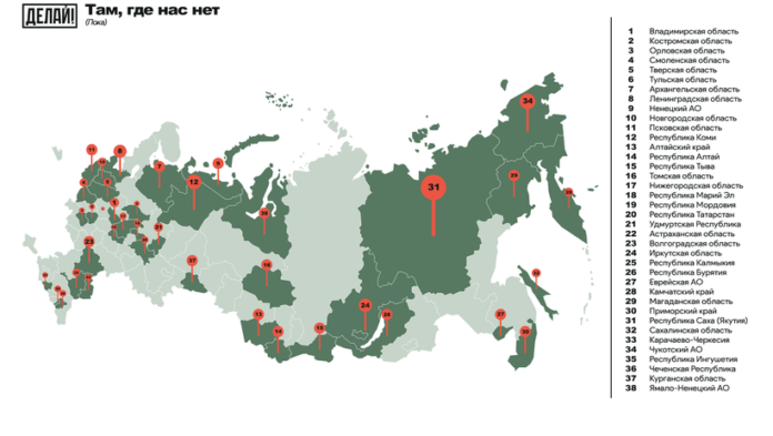 Ознакомиться со списком субъектов РФ, в региональные штабы которых требуются координаторы движения «Делай!», можно на карте. Если интересующий субъект не отмечен, значит, там уже имеется местный штаб проекта, куда можно вступить в качестве волонтера.
