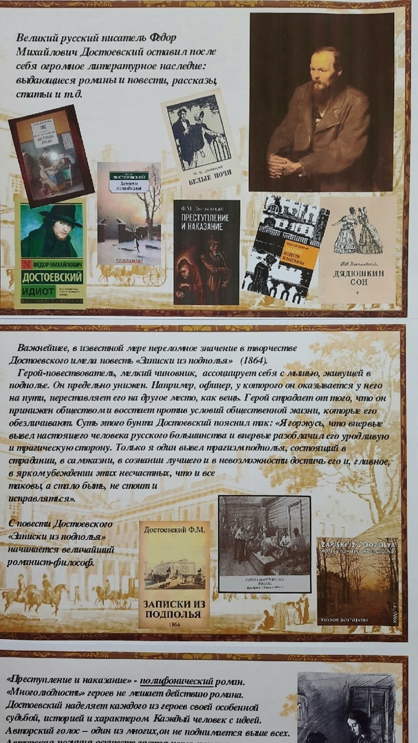 В рамках информационно- патриотического проекта «По страницам истории» специалистами МУ СП ДТМ «Молодёжный» представлены информационные стенды, посвященные 200- летию писателя. Один рассказывает о нелёгком жизненном пути Достоевского, другой приглашает нас пройти по страницам его произведений.