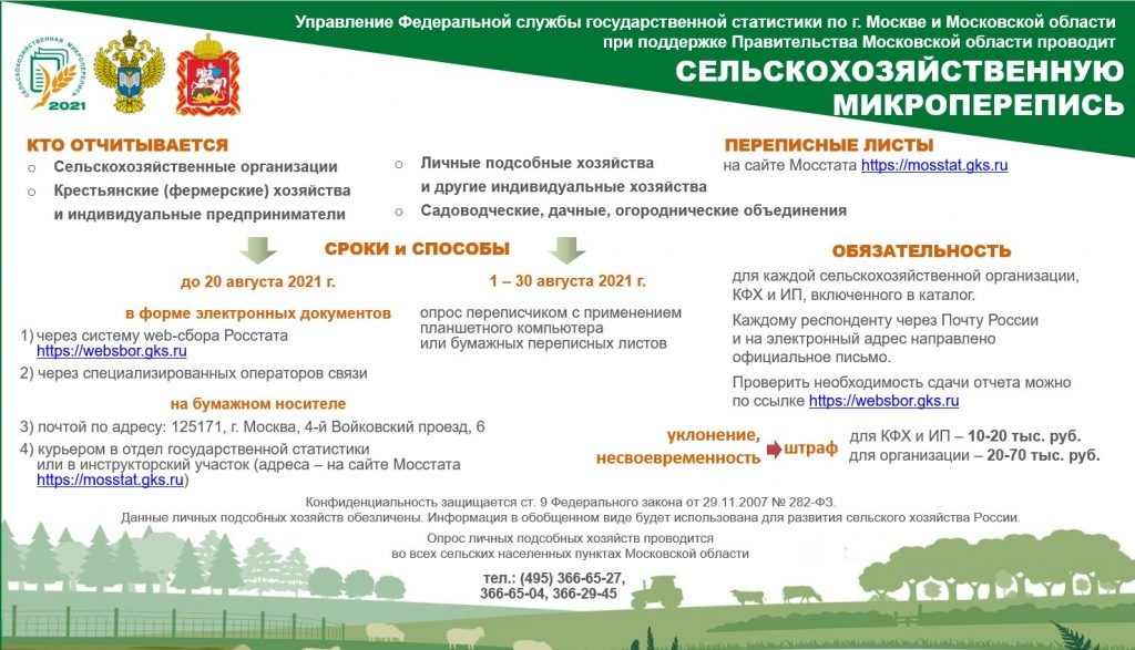 По возникающим вопросам сельскохозяйственной микропереписи-2021 можно также обращаться в отдел государственной статистики в городе Подольске: ул. Народная, дом 12, телефон 8 (4967) 69-98-34.