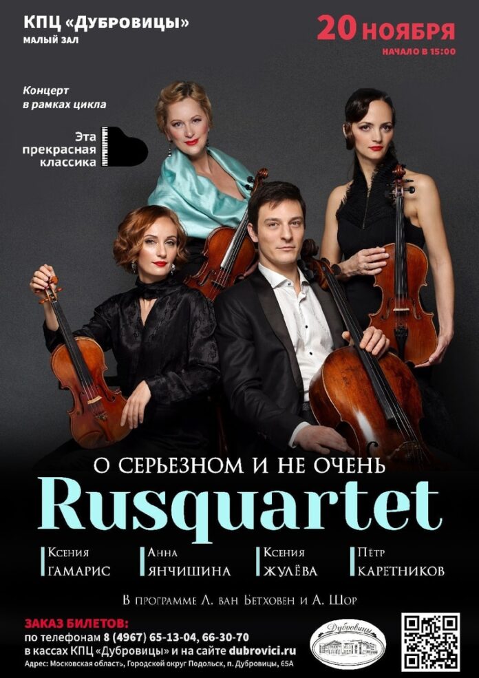 В субботу, 20 ноября в 15:00 Культурно-просветительский центр «Дубровицы» приглашает вас на концерт «О серьезном и не очень», который пройдет в рамках цикла «Эта прекрасная классика». Исполнители RUSQUARTET