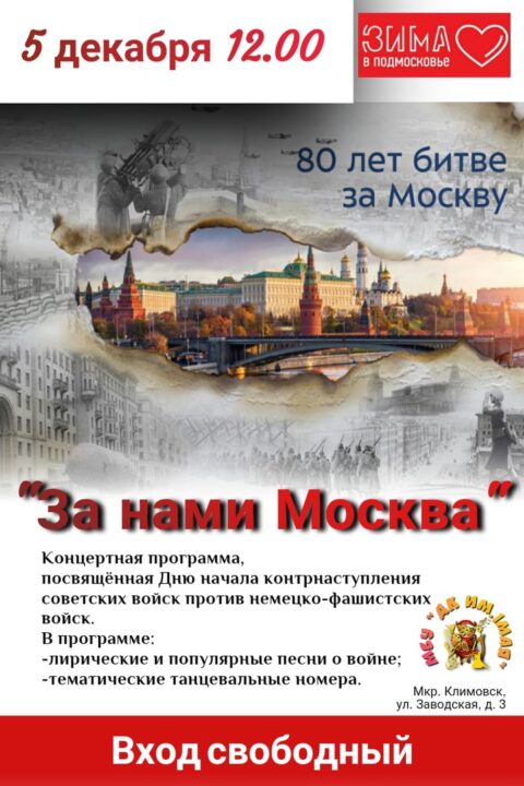 В воскресенье, 5 декабря в  12.00 Дом культуры им. 1 Мая приглашает всех желающих на концертную программу с участием творческих коллективов дома культуры, посвящённую 80-летию Битвы под Москвой. Адрес: микрорайон Климовск, ул.  Заводская д.3
