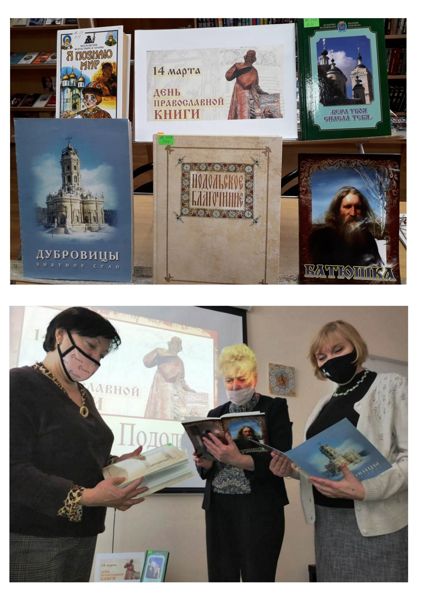 В преддверии Дня православной книги библиотека № 18 совместно с СДК «Молодёжный» подготовила для своих читателей литературное путешествие по Православным храмам Подолья. Была представлена книжная выставка «Золотые купола». Участники мероприятия познакомились с красочным изданием «Подольское благочиние», которое посвящено многовековой истории Православия на Подольской земле. Также библиотекарь рассказала о книгах «Вера твоя спасла тебя» и «Батюшка» — составитель Н. Скударь. Читатели библиотеки узнали об истории Троицкого собора г. Подольска и о церкви Всемилостивого Спаса в древнем селе Никулино.