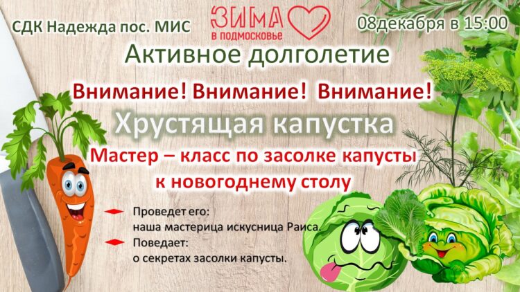 8 декабря в 15.00, в СДК «Надежда» поселка МИС, ожидаем всех хозяюшек, принять активное участие в нашем мастер – классе по засолке капусты. Проведет его наша мастерица искусница Раиса. Поведает о секретах засолки капусты. А во время работы можно будет спеть песни, частушки, так и готовить веселей, и капуста вкусней получится, с душой. У каждого будет возможность самим попробовать засолить капусту. Шинкованную капусту и натертую морковь перемешают с солью. Далее полученную овощную смесь отправят в банку на засолку.