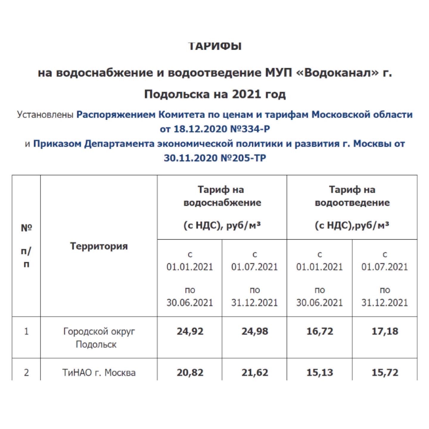 Напоминаем, что с 01 июля 2021 года согласно Распоряжению Комитета по ценам и тарифам Московской области от 18.12.2020 №334-Р и Приказу Департамента экономической политики и развития г. Москвы от 30.11.2020 №205-ТР для абонентов МУП «Водоканал» на территории Г.о. Подольск и ТиНАО г. Москвы изменяются тарифы холодного водоснабжения и водоотведения.