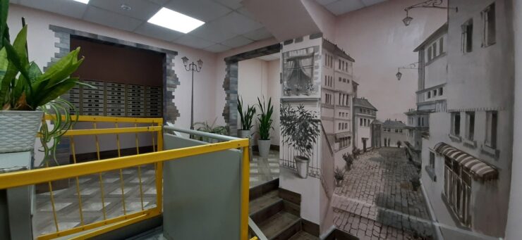 Рисунок стал частью ремонта на первом этаже: пол выложен плиткой с рисунком. Заменены светильники, почтовые ящики, установлены изящные горшки с живой зеленью. Совместными усилиями отремонтирована входная группа, лестница, лифтовый и квартирный холлы 1 этажа.