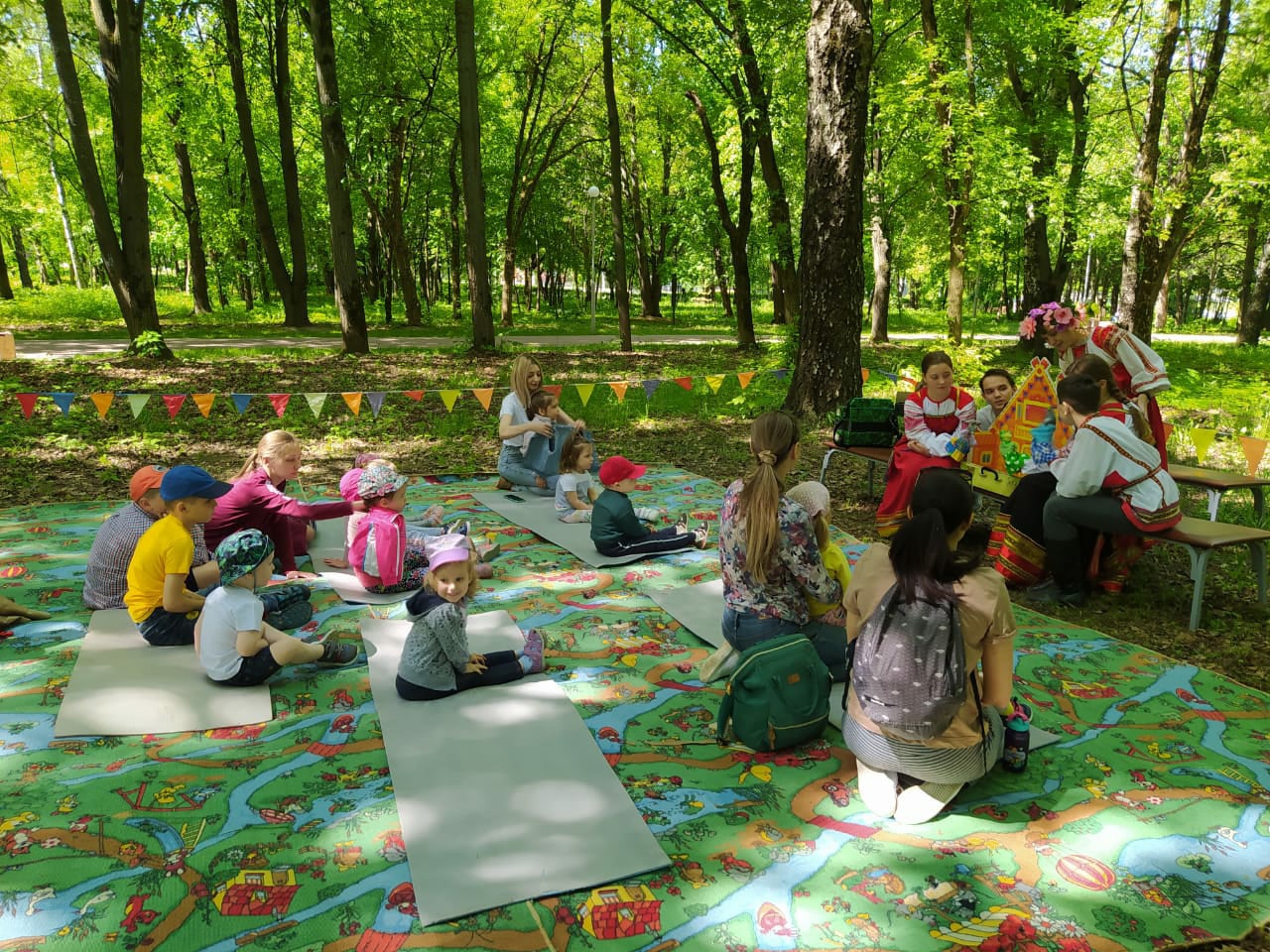 Дружно распевая песни,  маленькие туристы без труда добрались до тенистой лужайки, где ребят уже поджидали артисты ОК фольклорного ансамбля «Ленок» с кукольным спектаклем по мотивам русской народной сказки «Теремок».