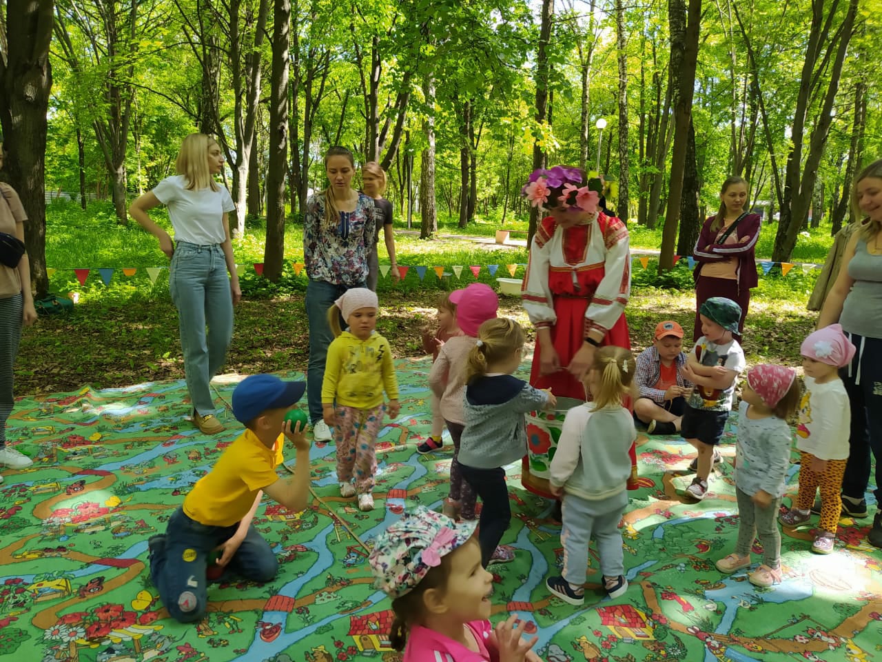 Все с удовольствием расположились на ковре и кукольное представление полностью завладело вниманием маленького зрителя: широко распахнув глаза, детки с особым вниманием смотрели сказку из старого чемодана. В завершении праздничного пикника для ребят провели веселые эстафеты.