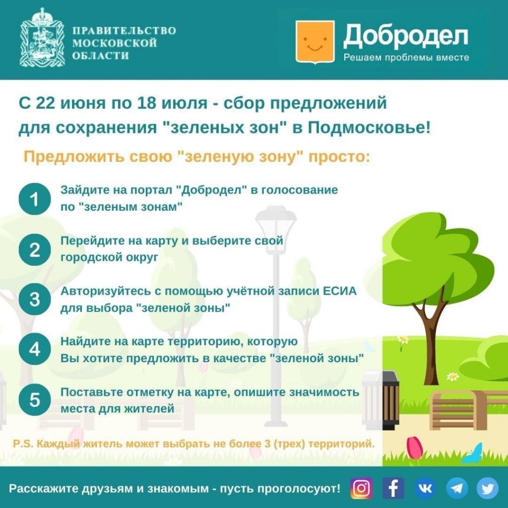Сбор предложений по «зеленым зонам» продлится до 18 июля, после чего будут отобраны наиболее популярные зоны для внесения в Региональную географическую информационную систему, включающую сведения о зеленых насаждениях и благоустроенных территориях в границах населенных пунктов, а также для использования в работе ведомств Правительства Московской области..