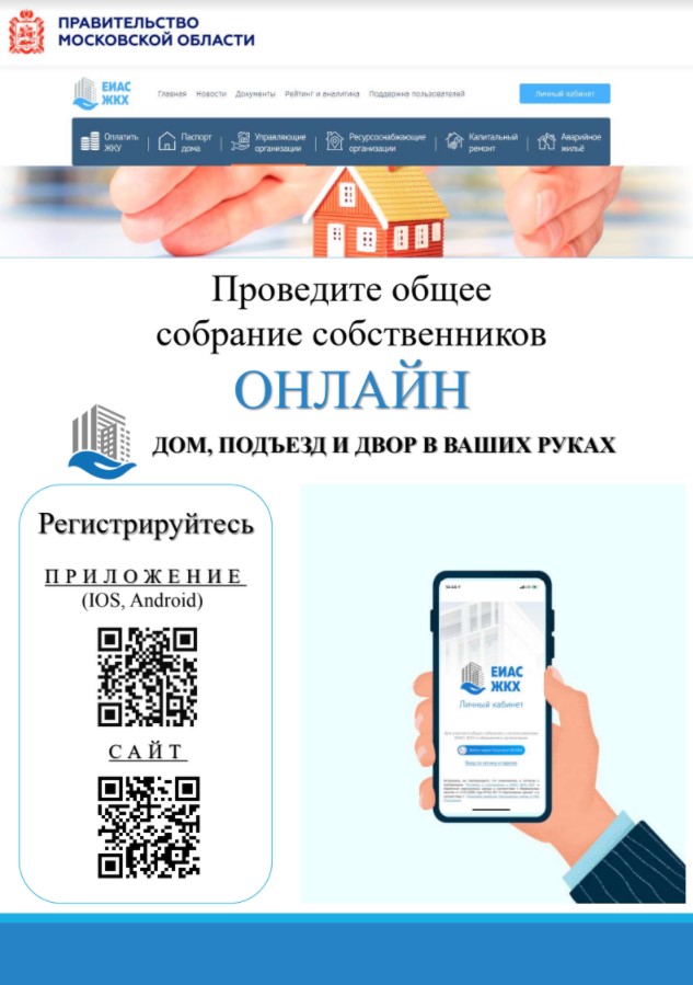 Провести общедомовое собрание в онлайн-формате жители Подмосковья могут как с помощью личного кабинета на сайте dom.mosreg.ru, так и в мобильном приложении «ЕИАС ЖКХ», которое можно скачать на цифровых площадках AppStore и Google Play. Текущий сервис доступен для каждого пользователя, зарегистрированного на портале ЕИАС ЖКХ и Госуслугах РФ. Собственник может сам инициировать новое собрание и оставить свой голос за уже открытый соседями или управляющей организацией вопрос.
