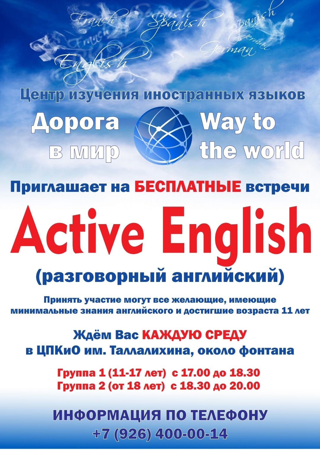 Приглашаем всех желающих с минимальным уровнем знания английского языка попрактиковать разговорный английский, возраст участников от 11лет.