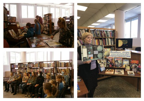 В ходе беседы юные читатели показали хорошие знания о планетах и звездах Солнечной системы, назвали животных, побывавших в космосе. Школьники смогли закрепить свои знания, познакомившись с книжной выставкой и посмотрев фильм «Таинственный мир планет».