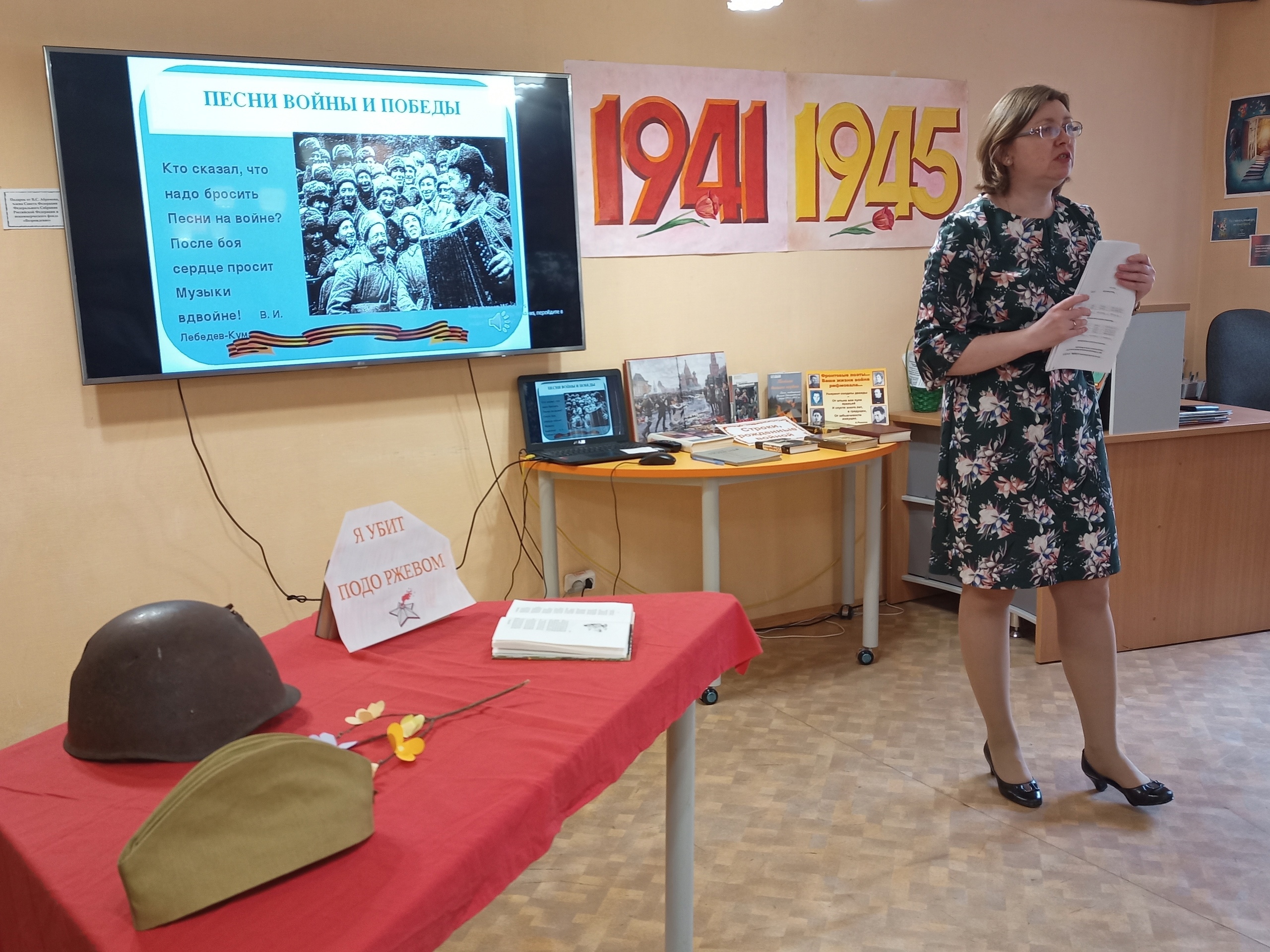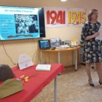 Был и незабываемый момент — по счастливой возможности в библиотеке оказалась солдатская каска советского солдата, которая была найдена поисковиками под г. Ржевом, вся в осколках. У ребят была возможность прикоснуться к реликвии, найденной спустя 80 лет. Они рассматривали ее и слушали стихотворение А. Твардовского «Я убит подо Ржевом».