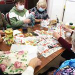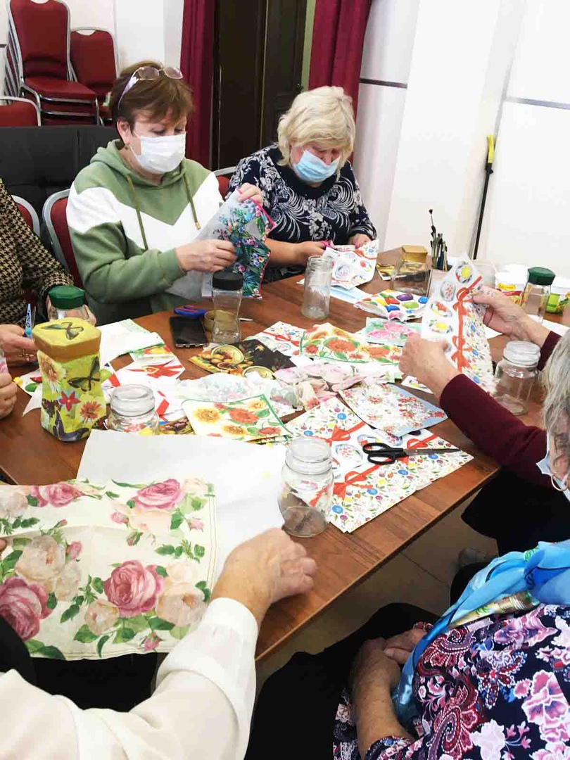 И в заключение все с удовольствием занялись творчеством, в этот раз осваивали технику декупажа по стеклянным рельефным банкам при помощи разноцветных бумажных салфеток и клея. Это занятие- вырезание рисунков, нанесение клея кисточкой – тренировка мелкой моторики очень благотворно для сохранения памяти, ясности ума и полезно для суставов рук.
