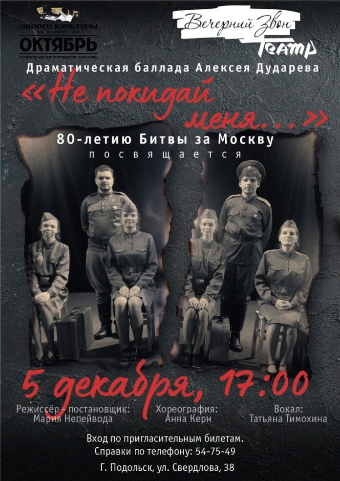Дорогие зрители , 5 декабря , в день воинской славы России, образцовый коллектив «Театральная студия «Вечерний звон» спешит пригласить вас на спектакль по пьесе Алексея Дударева «Не покидай меня».