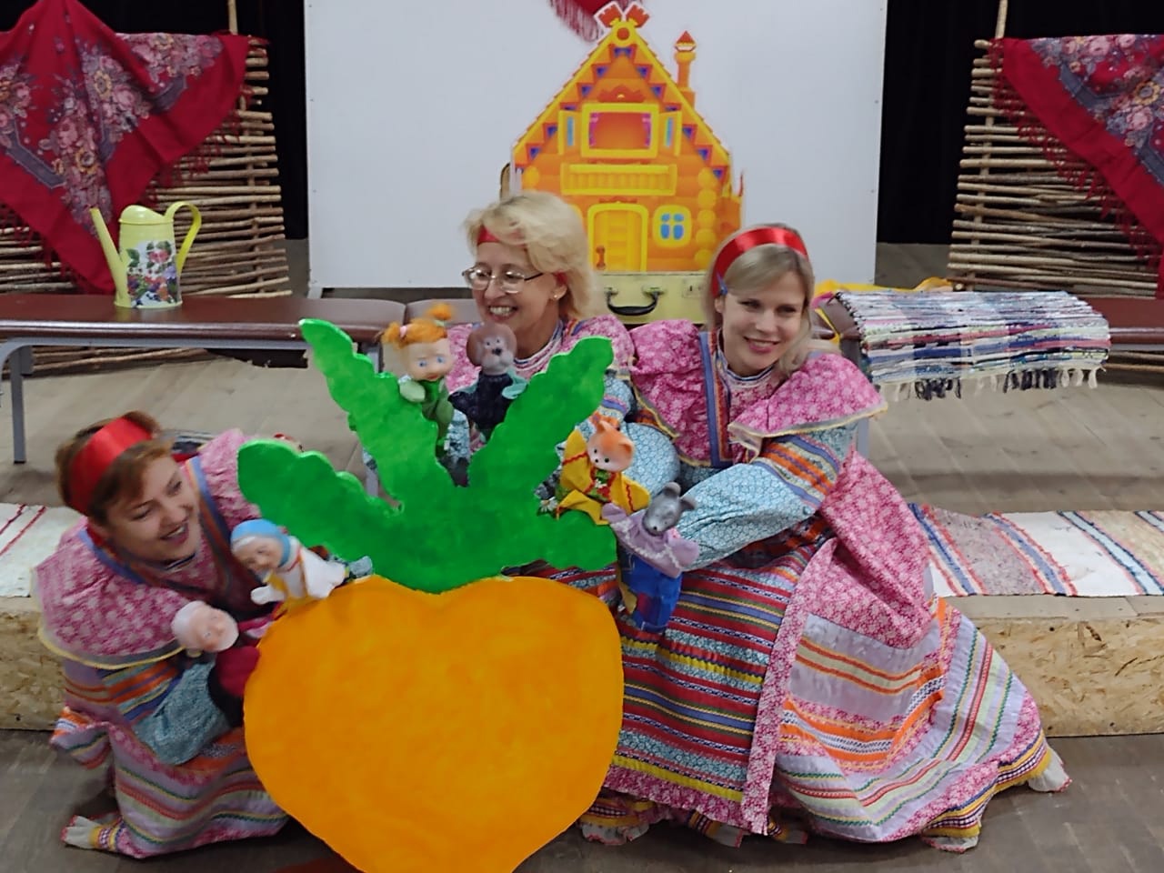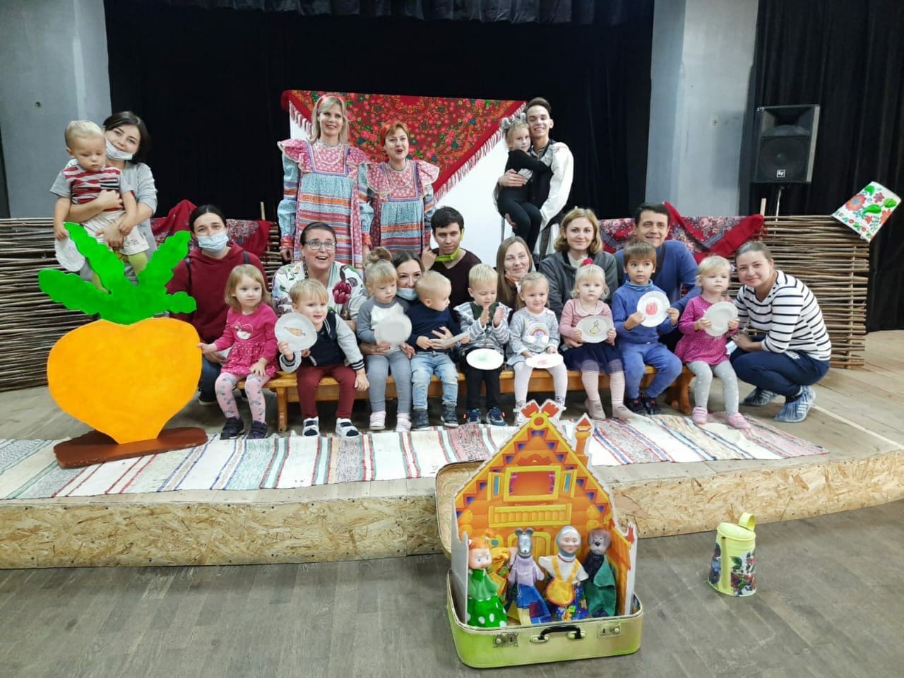 Традиционно встреча началась с показа кукольного спектакля. Перед ребятами , как по волшебству, из театрального чемоданчика появлялись персонажи русской народной сказки «Репка». Общими дружными усилиями маленьких зрителей, герои сказки справились с Репкой.