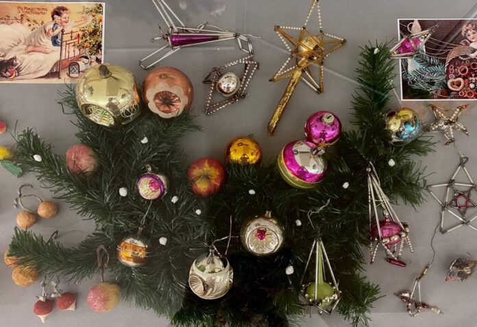 Все представленные на выставке новогодние украшения относятся к советскому периоду и предоставлены коллекционером, другом музея Ольгой Александровной Рябцевой, которая коллекционирует и реставрирует игрушки, сделанные в СССР в 1930-1980 годах.