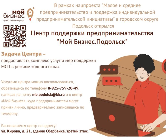 Адрес Центра поддержки предпринимательства «Мой бизнес.Подольск»: Подольск, ул. Кирова, д. 21, третий этаж (здание Сбербанка).