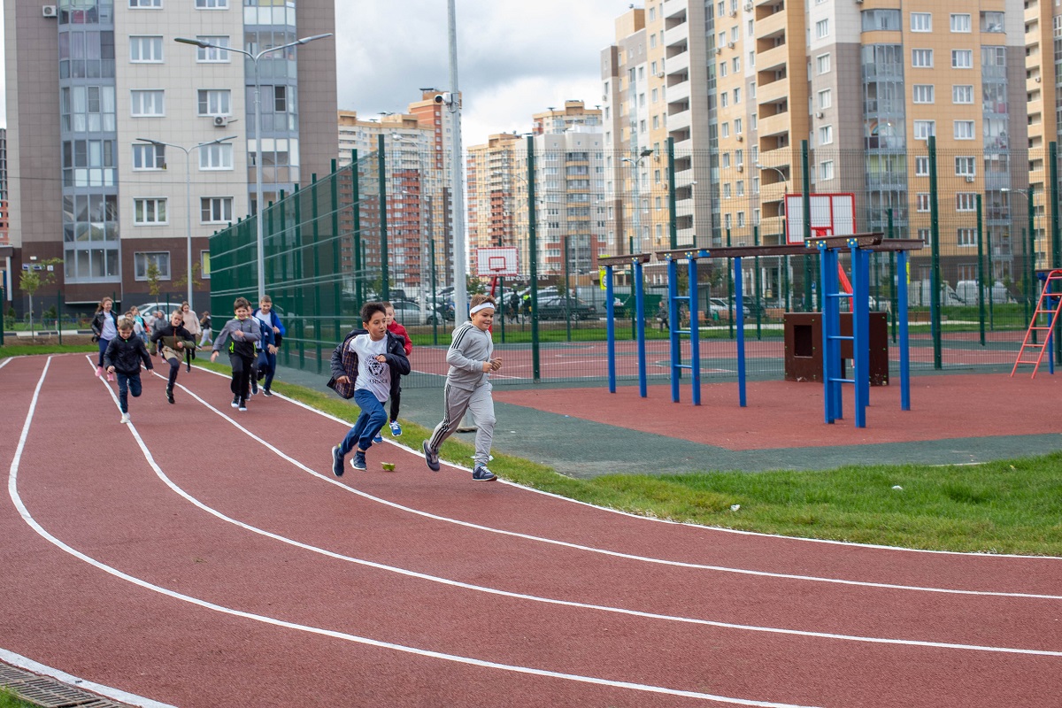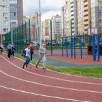 Активно проводят время учащиеся на уроках физкультуры в школьном дворе, где оборудована специальная спортивная зона для разных возрастных групп под открытым небом. К примеру, ученики 9-х классов осваивают методику челночного бега и преодолевают полосу препятствий, а ребята начальных классов принимают участие в веселых играх-эстафетах.