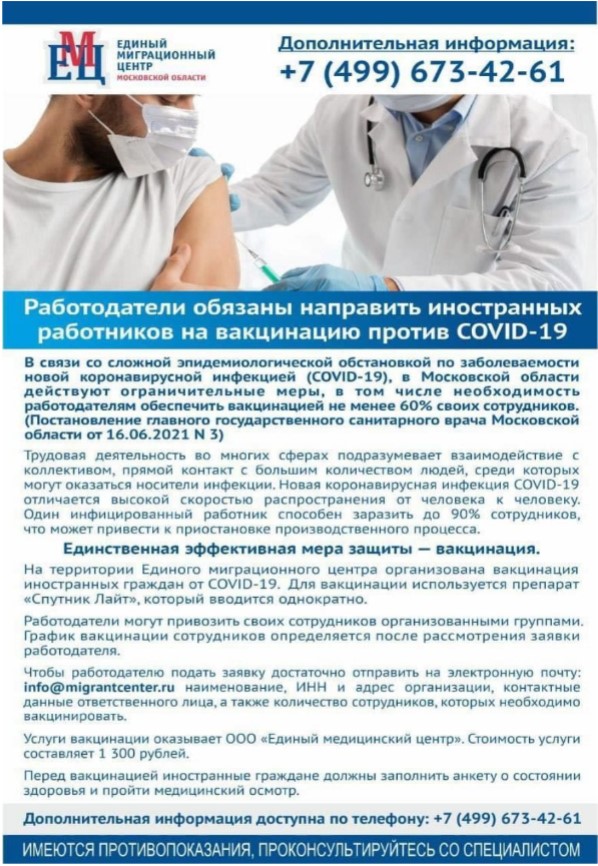 Вакцинация иностранных граждан против COVID-19 организована на территории Единого миграционного центра Московской области, под первый этап прививочной кампании закуплено 100 тысяч доз однокомпонентной вакцины «Спутник Лайт».
