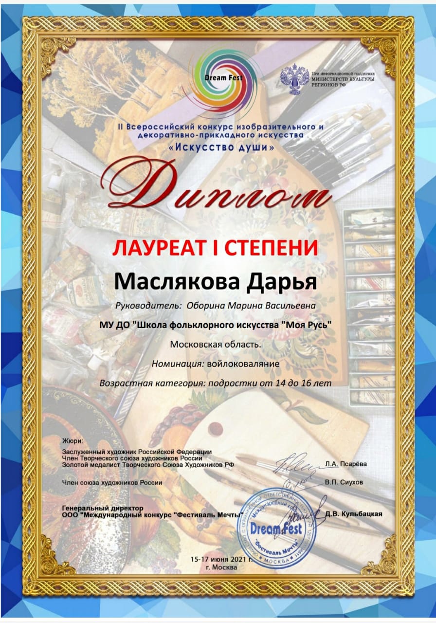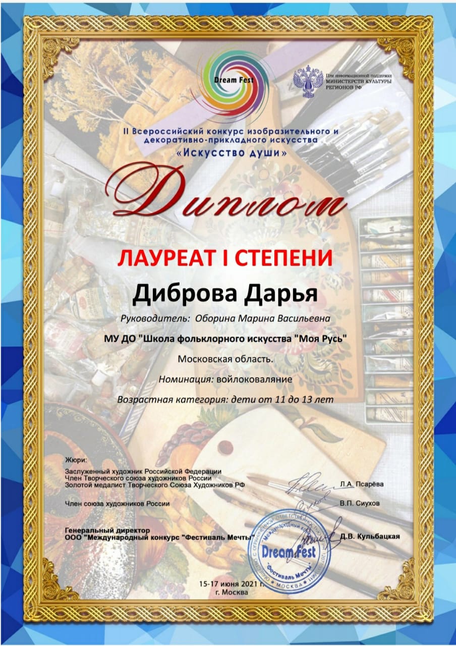 15 — 17 июня 2021г. учащиеся школы фольклорного искусства «Моя Русь» специализация «Валяние» приняли участие во II Всероссийском конкурсе изобразительного искусства и декоративно-прикладного творчества «Искусство души» г. Москва. По результатам конкурса Маслякова Дарья награждена дипломом лауреата 1 степени, Диброва Дарья — дипломом лауреата 1 степени.