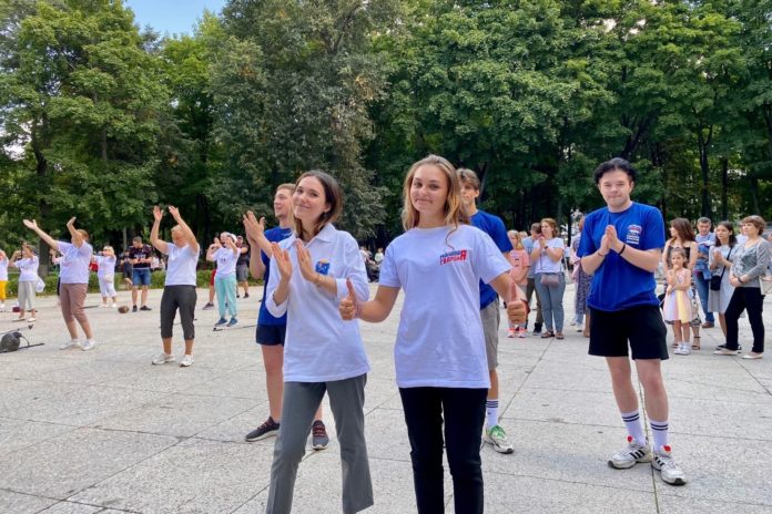 Утро 14 августа активисты МГЕР и Подольского союза молодежи начали с разминки с Олимпийской чемпионкой по легкой атлетике Юлией Гущиной.