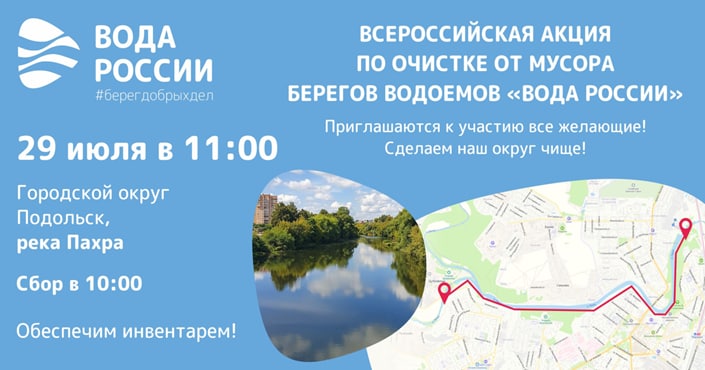 В рамках Всероссийской акции «Вода России» в городском округе Подольск пройдет очередное мероприятие по очистке береговой линии реки Пахры.
