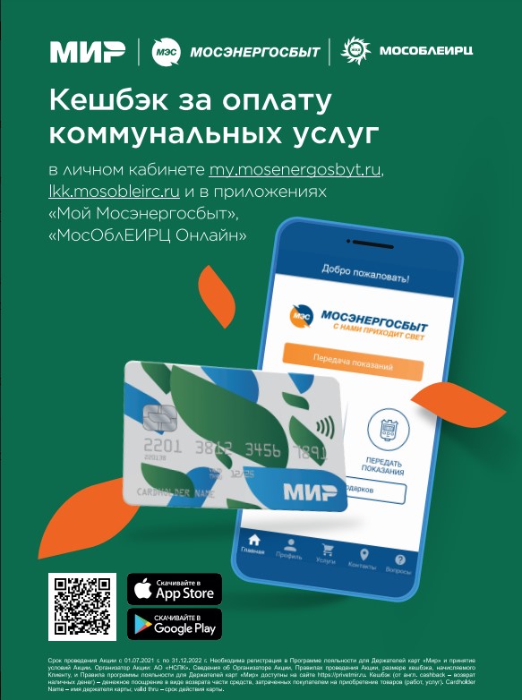 Акция «Кешбэк за оплату коммунальных услуг в Мосэнергосбыт и МосОблЕИРЦ картой «Мир» проходит с 1 июля 2021 по 31 декабря 2022 года. Правила акции можно посмотреть ЗДЕСЬ.