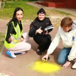 Организаторы акции подготовили специальные трафареты, с помощью которых нанесли на асфальтовое покрытие тематические лозунги, чтобы обратить внимание пешеходов и велосипедистов на соблюдение правил безопасности при переходе проезжей части.