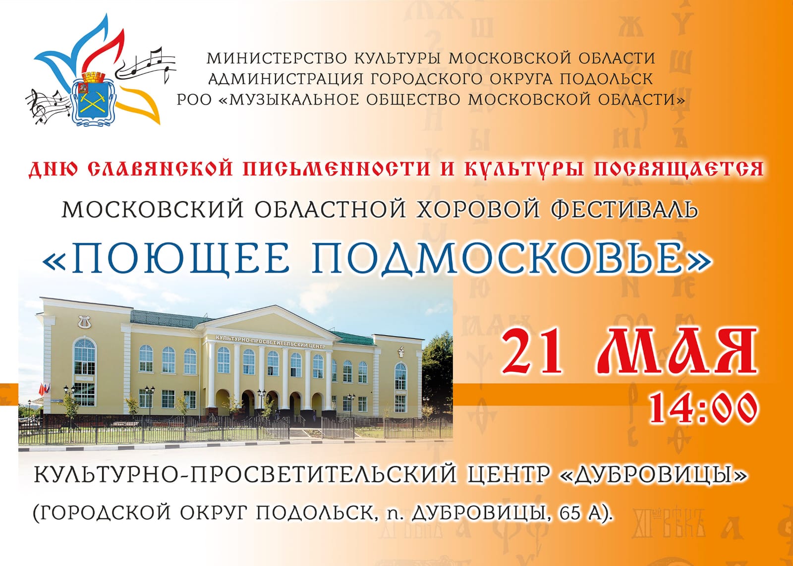 21 мая в Культурно-просветительском центре «Дубровицы» состоится традиционный Московский областной хоровой фестиваль «Поющее Подмосковье», посвященный Дню славянской письменности и культуры