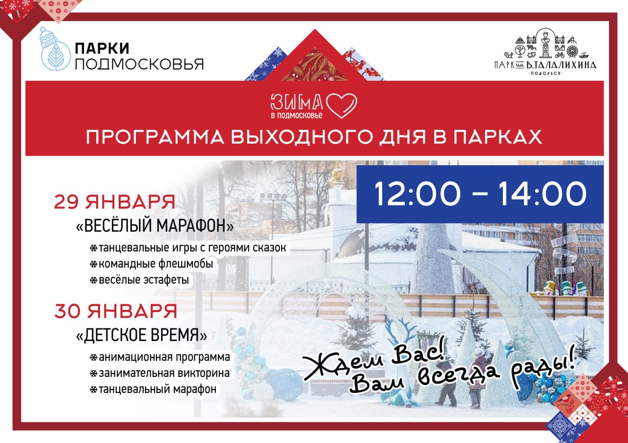 Программы выходного дня в парках Городского округа Подольск в рамках проекта губернатора «Зима в Подмосковье» продолжаются. Интерактивные и развлекательные программы, подготовленные учреждениями культуры администрации муниципалитета, запланированы 29 и 30 января, 5, 6, 12, 13, 19, 20, 26 и 27 февраля.
