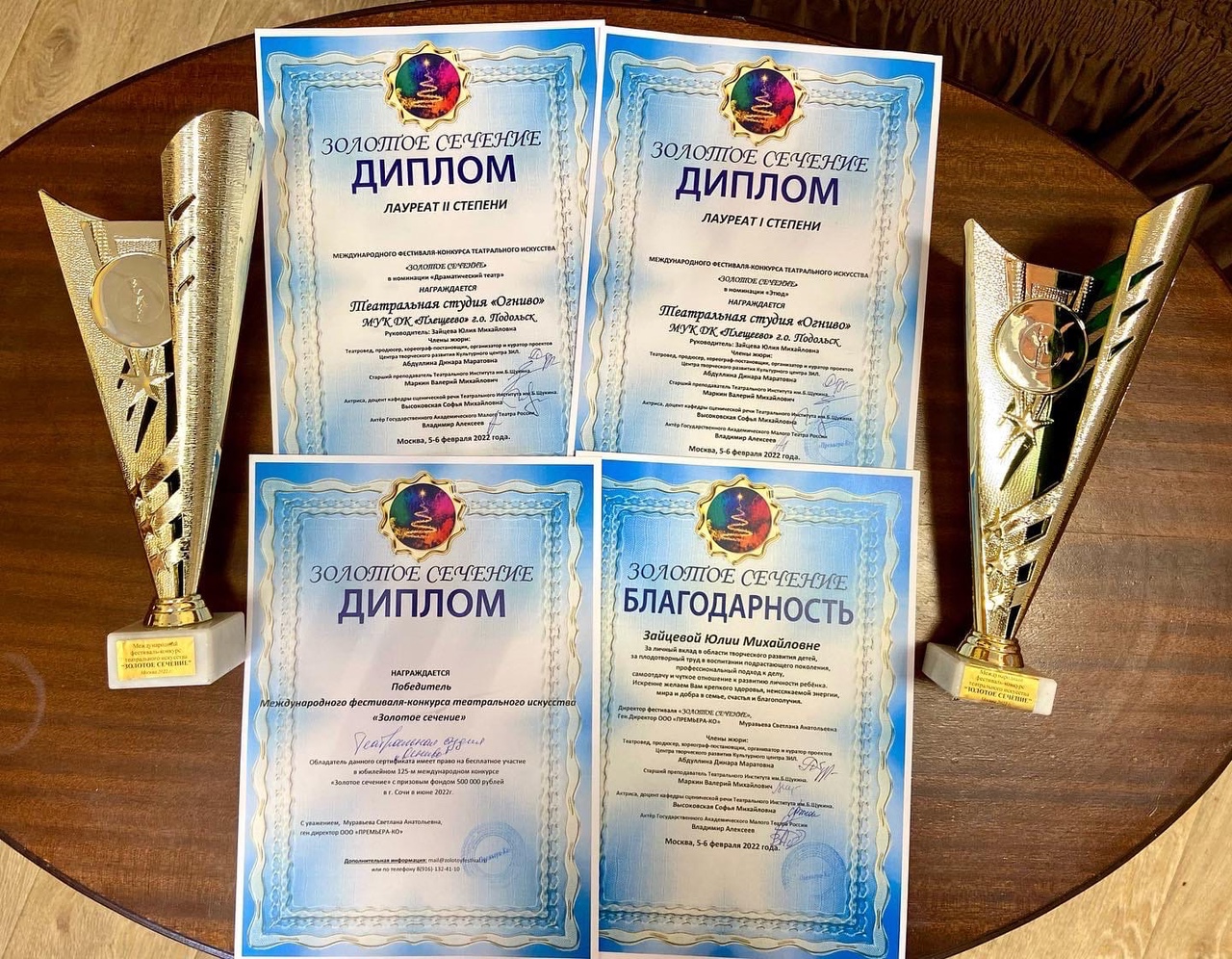Театральная студия «Огниво» приняла участие в Международном фестивале-конкурсе театрального искусства «Золотое сечение», который прошёл 5 и 6 февраля , в Театральном институте им. Б.Щукина. В тяжёлой борьбе ребята завоевали звания Лауреатов 1 и 2 степени, а ещё получили сертификат на бесплатное участие в финале конкурса, который будет проходит в городе Сочи. Мы от души поздравляем всех воспитанников театральной студии «Огниво» и руководителя Зайцеву Юлию Михайловну с заслуженными наградами.