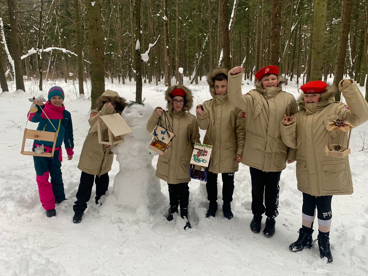 Юные патриоты самостоятельно изготовили кормушки, насыпали корм для наших пернатых друзей и развесили их в лесном массиве рядом с родной школой.