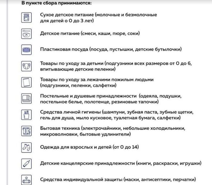 Все предметы гуманитарной помощи должны быть новыми (в цельной упаковке, с этикетками), продукты питания — длительного срока хранения с действительным сроком годности.