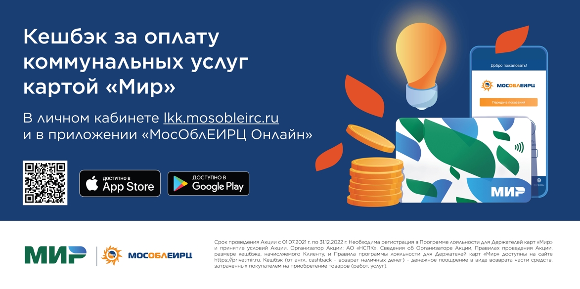 — оплатить коммунальные услуги зарегистрированной картой «Мир» через личный кабинет или мобильное приложение «МосОблЕИРЦ Онлайн».