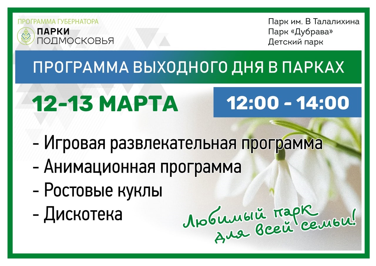 В рамках губернаторской программы «Парки Подмосковья» в парках Городского округа Подольск 12 и 13 марта пройдут программы выходного дня. Посетить мероприятия можно в парке культуры и отдыха имени Виктора Талалихина в Подольске на ул. Рабочей, 5б, в микрорайоне Климовск в парке «Дубрава», расположенном на улице Победы, 3, и в Детском парке культуры и отдыха на ул. Заводской, 6а.